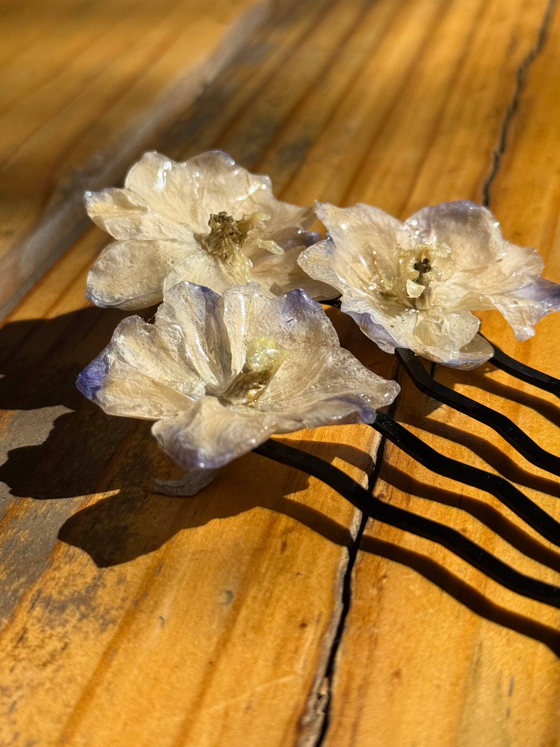 Inspired by the delicate beauty of Aurora skies, this hair fork features real delphinium blossoms, preserved and sealed in resin. Over time, the petals have taken on a soft vintage hue, giving each piece a unique, ethereal charm. Perfect for adding a touch of romance to any hairstyle.