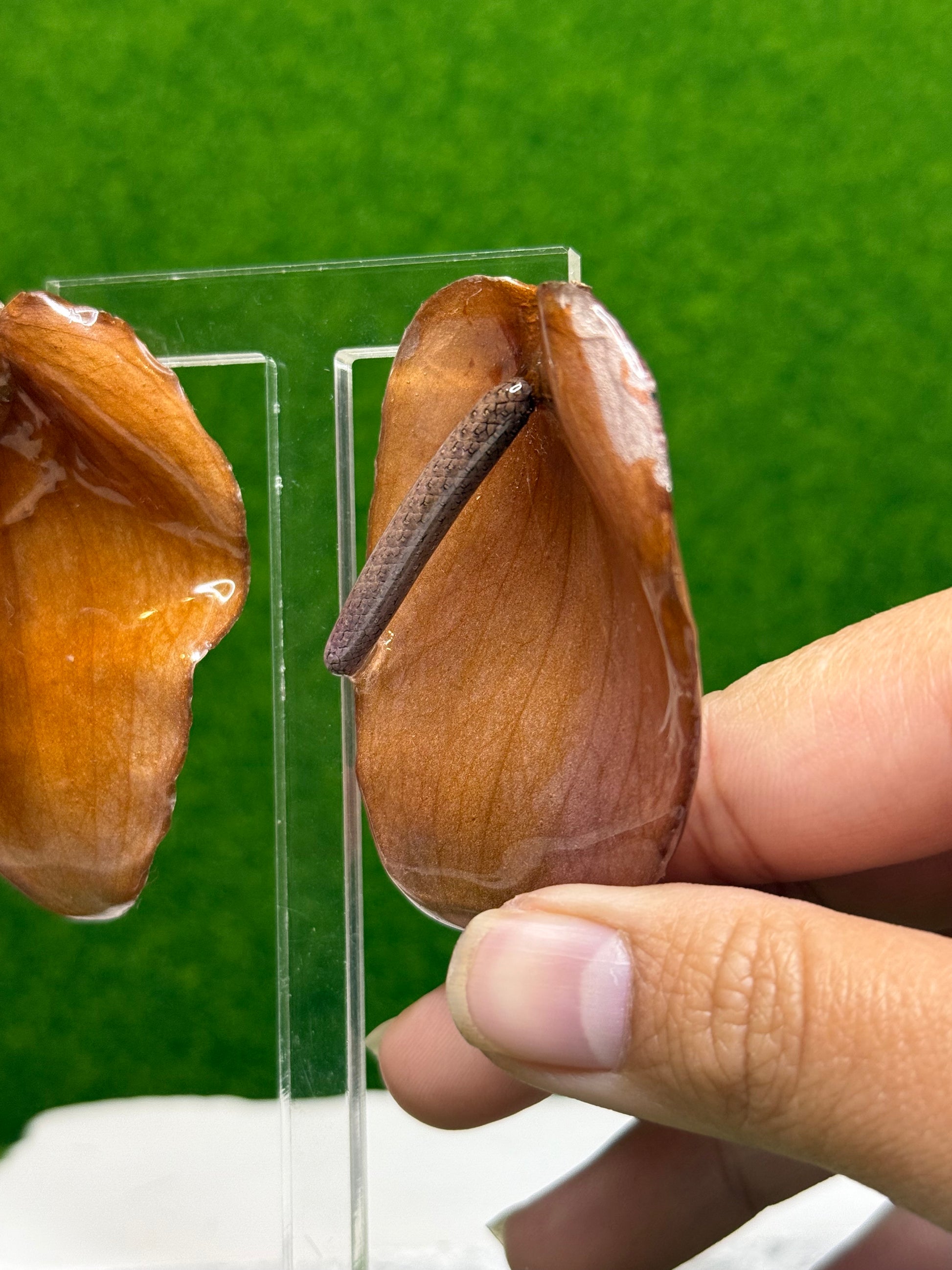 Bold and expressive, this one-of-a-kind earring features a preserved brown anthurium bloom with a subtle natural imperfection. The organic variation adds character and uniqueness, making it a true statement piece shaped by nature and handcraft.