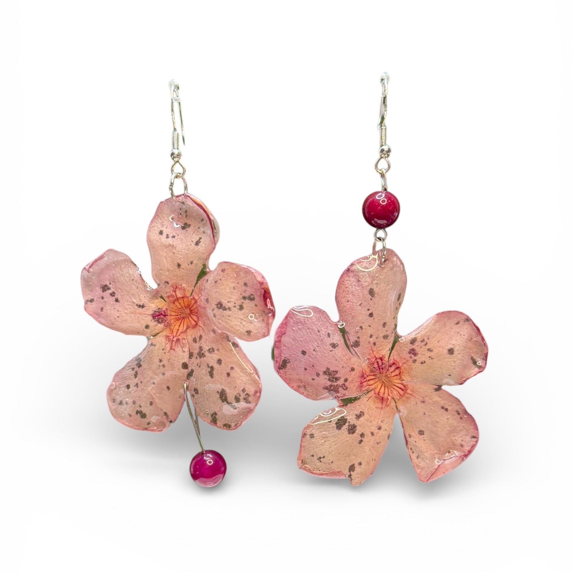 Artful and expressive, these handmade earrings feature preserved pink desert rose blooms paired with magenta agate crystals. During the natural drying process, the petals developed a soft polka-dot texture — a unique organic pattern that makes each piece truly one of a kind.