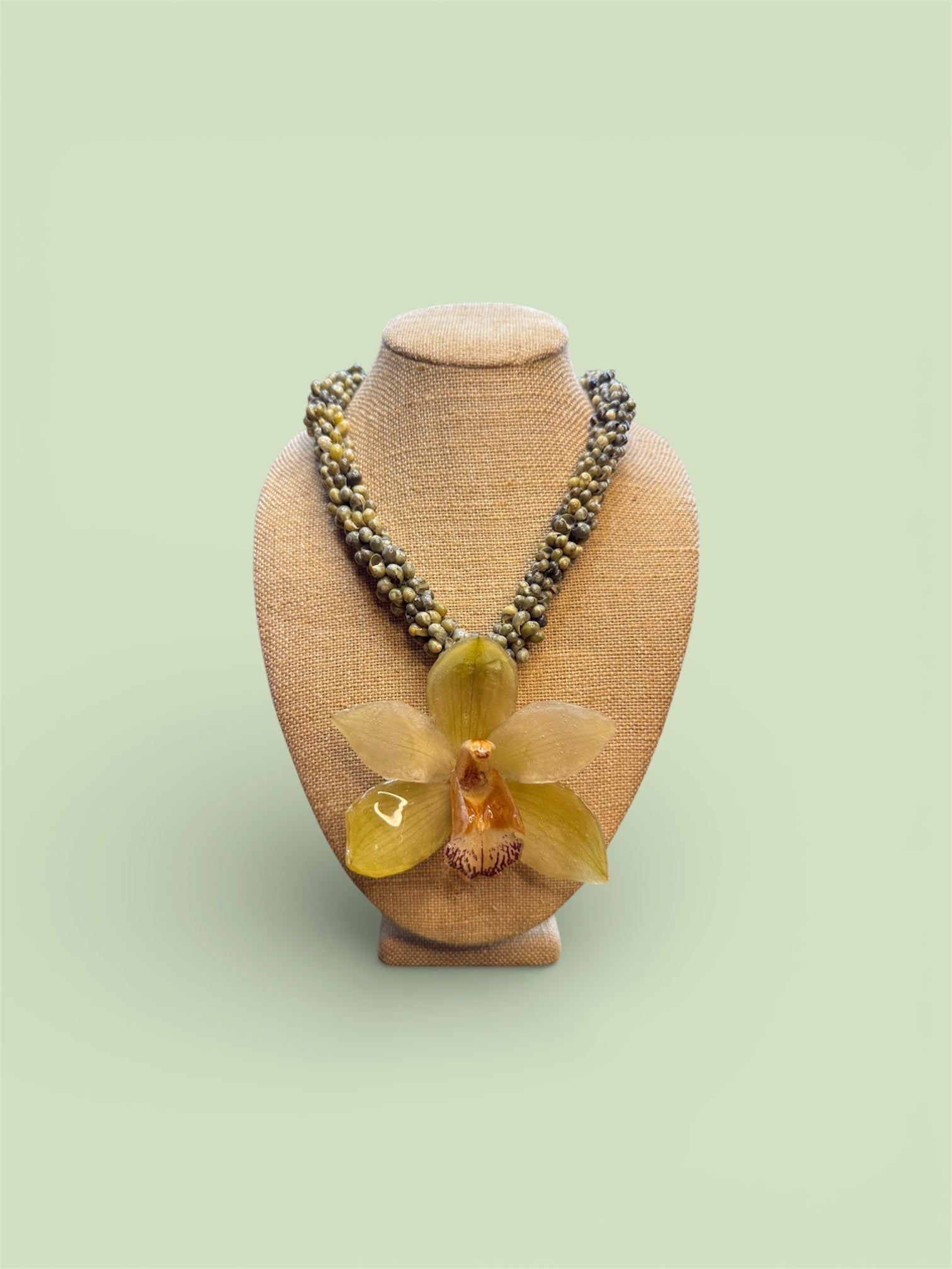 Fresh and serene, this handmade necklace features a preserved green cymbidium orchid as its centerpiece, suspended from a strand of natural seashell beads. The lush green bloom meets coastal textures, creating a piece that feels both grounding and elegant.