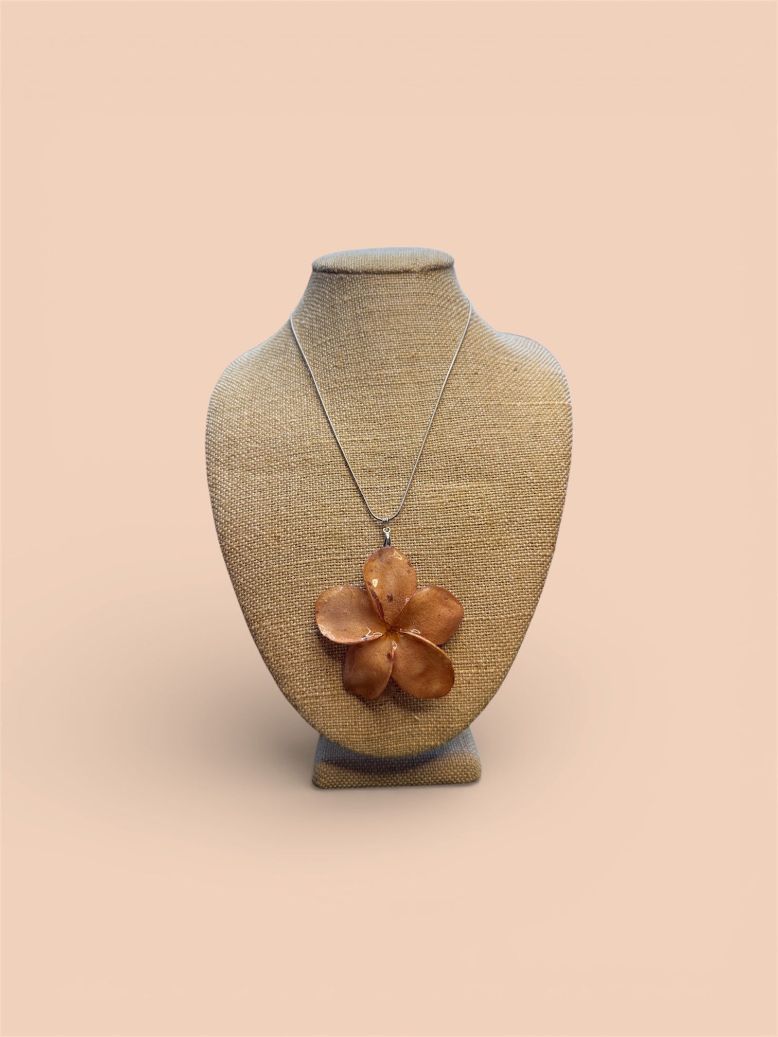Warm and understated, this handmade necklace features a preserved pink plumeria that has gently transformed into a soft beige tone through natural sunlight. Paired with a silver 18-inch chain, the bloom carries a sun-kissed, vintage elegance that makes each piece truly unique.